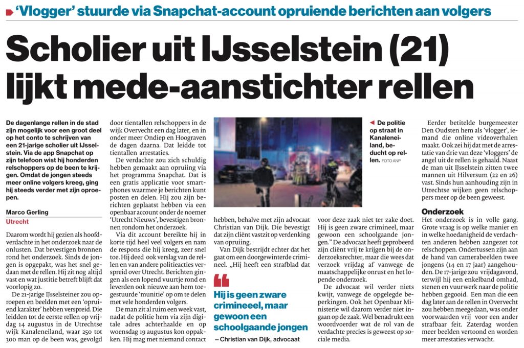 Onze cliënt zit op dit moment in beperkingen, zodat over de zaak inhoudelijk niets gedeeld kan en mag worden. Hieronder wel nadere informatie op basis van onderzoek door de redactie van het AD:https://www.ad.nl/utrecht/hoe-een-scholier-21-uit-ijsselstein-met-zijn-snapchat-account-hoofdverdachte-werd-van-de-utrechtse-rellen~afc85e0b/?referrer=https://www.google.com/